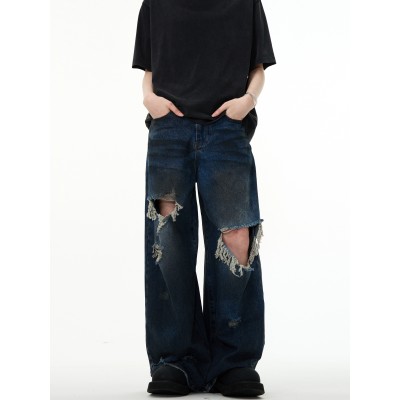 アメリカンレトロなダメージ加工デザインフロアレングスジーンズ、ニッチなハイストリートのゆったりとした万能ワイドレッグパンツ