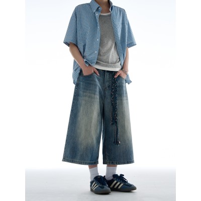 レトロなウォッシュ加工の竹ストライプ柄の7クォータージーンズ。ゆったりとしたストレートレッグデザインで、男女兼用。カジュアルパンツ。